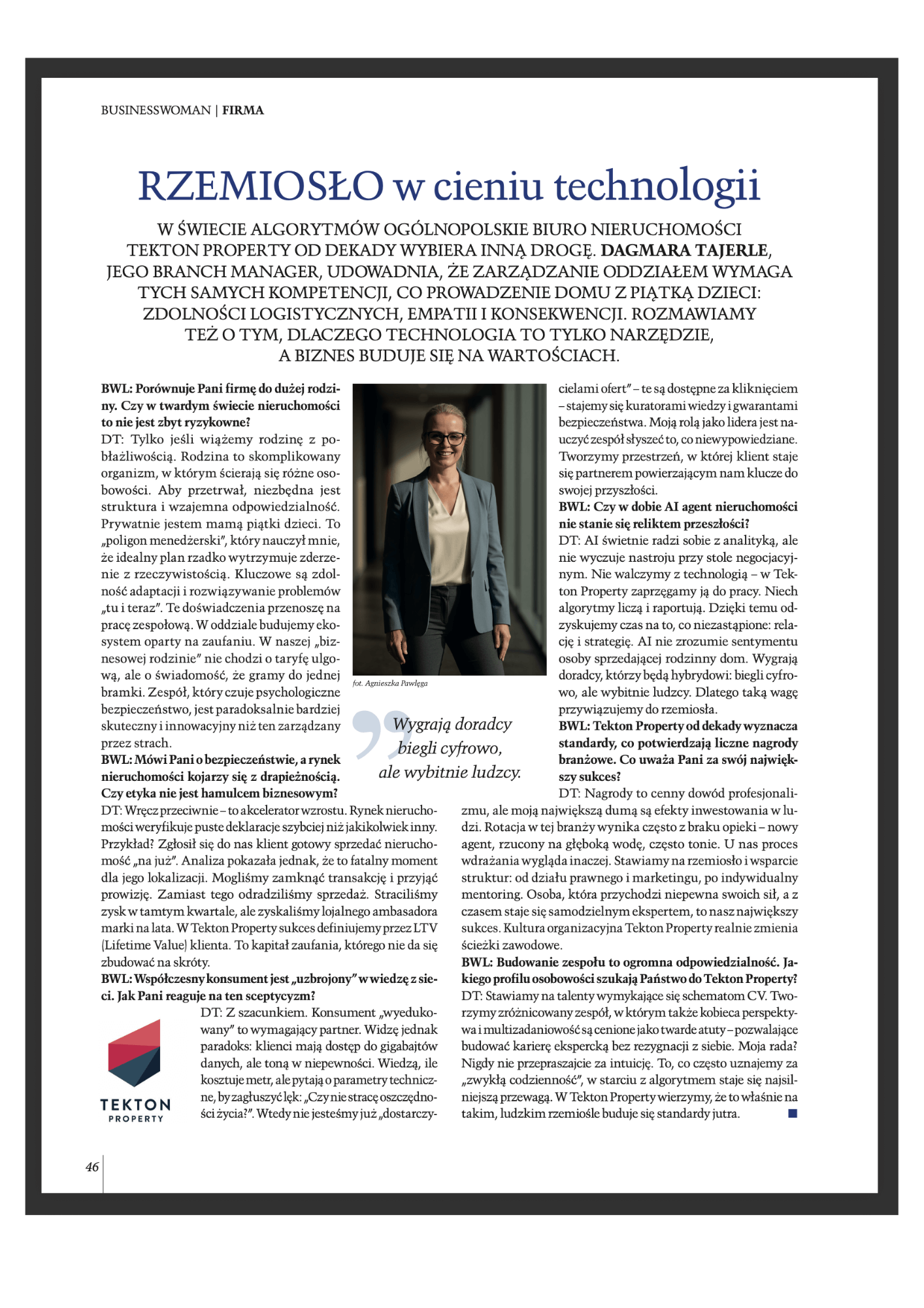 W świecie zdominowanym przez algorytmy Tekton Property od dekady wybiera inną drogę. Dagmara Tajerle, Branch Manager w Tekton Property, na łamach magazynu „Businesswoman & Life” udowadnia, że w nowoczesnym biznesie to właśnie ludzkie rzemiosło, intuicja i empatia stają się walutą premium.