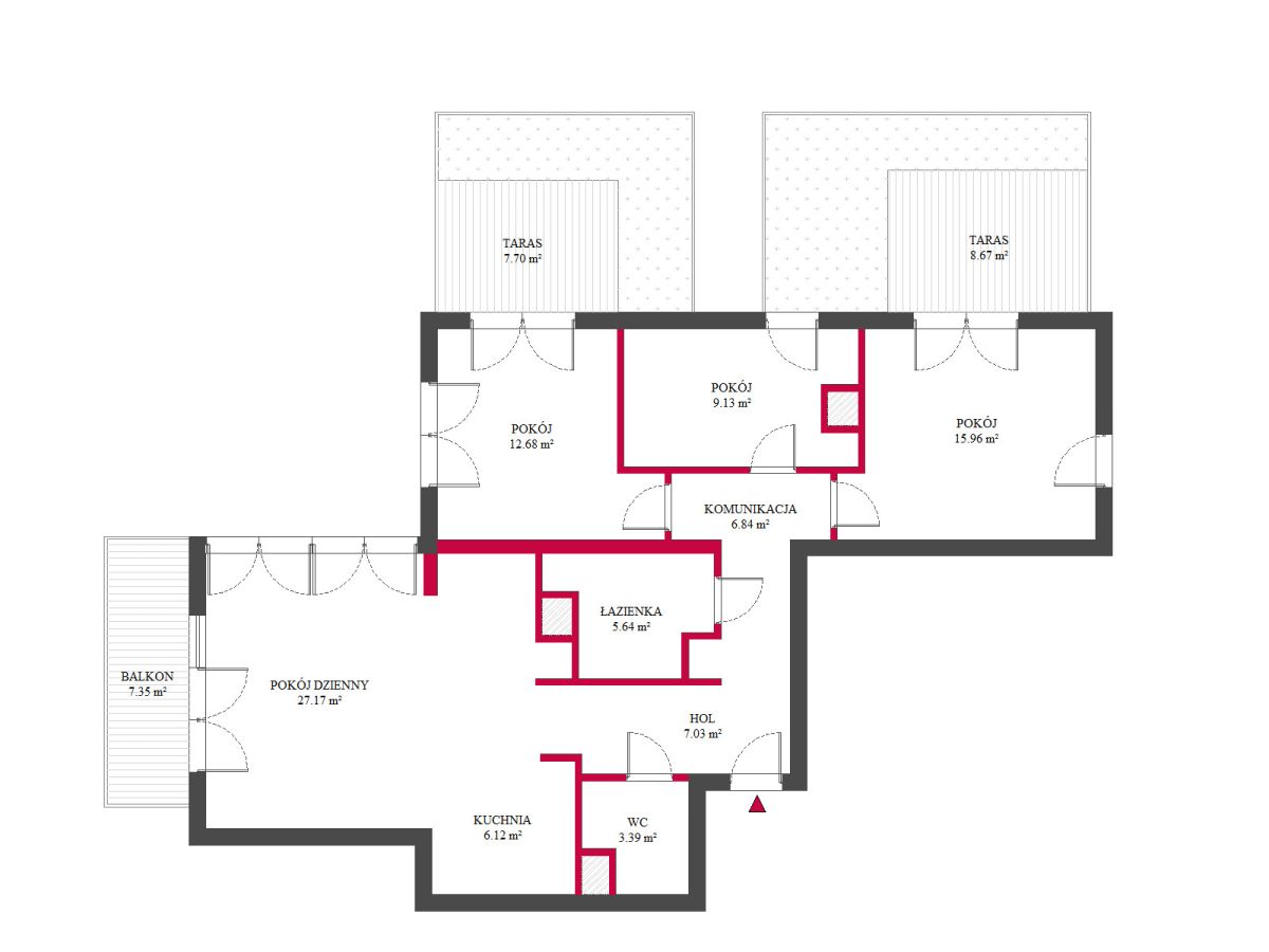 • dwie ustawne sypialnie (12,98 m² i 15,96 m²), każda z wyjściem na prywatny taras