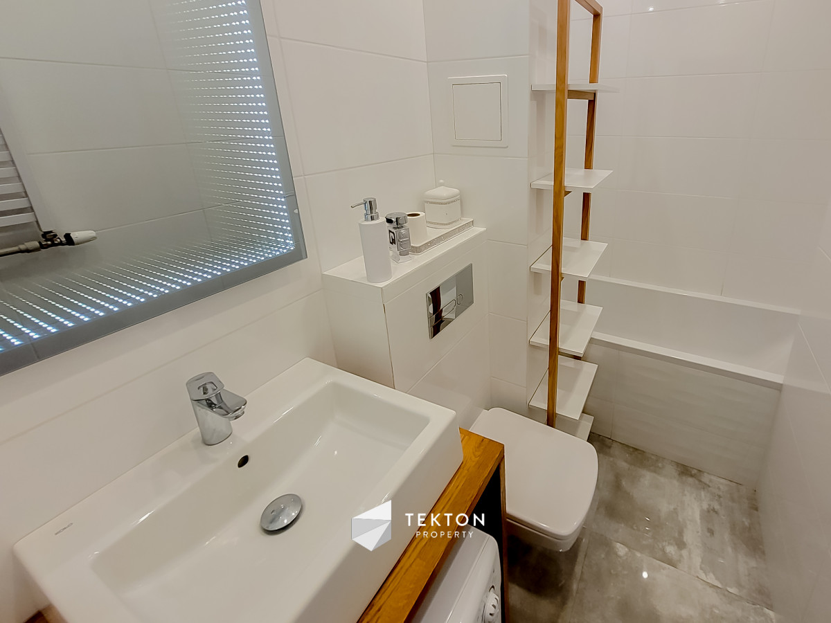 • Stylowa łazienka wykończona w wysokim standardzie – wanna, umywalka, pralka w zabudowie.