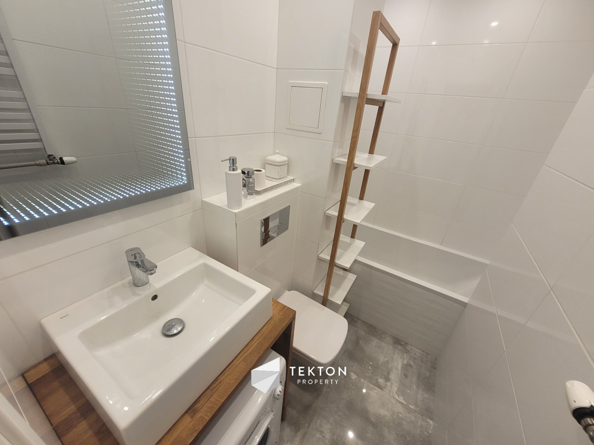 - Stylowa łazienka wykończona w wysokim standardzie – wanna, umywalka, pralka w zabudowie.