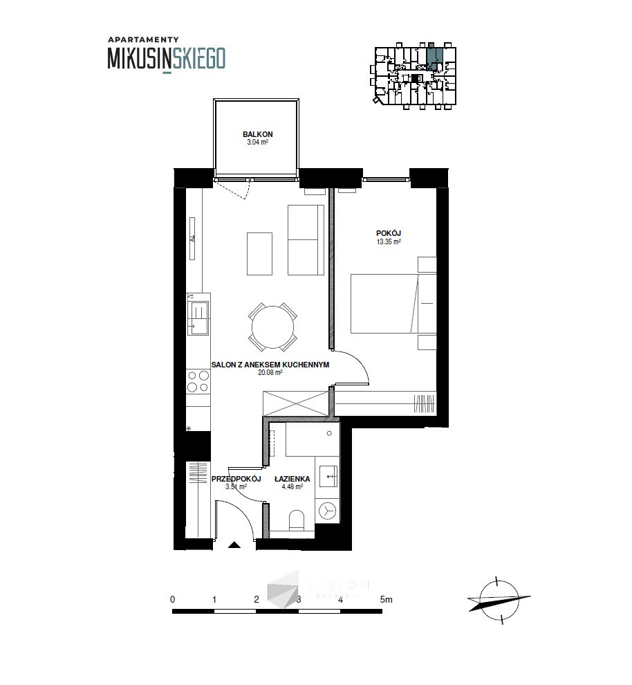 – Salonu z aneksem kuchennym (20 m²),