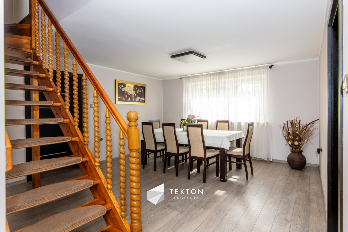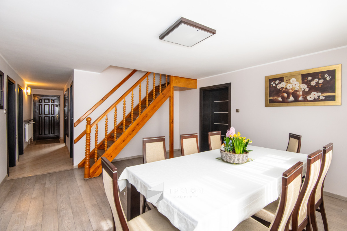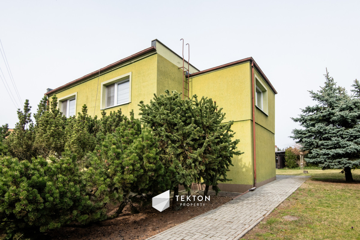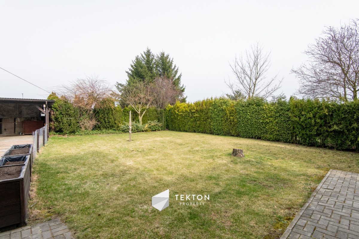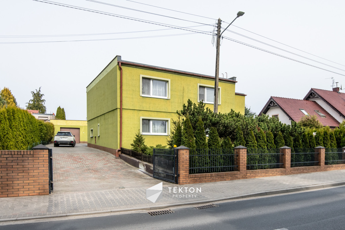 Piętro posiada możliwość niezależnego wejścia zarówno z zewnątrz, jak i poprzez schody wewnętrzne. Dzięki temu dom daje dużą swobodę w organizacji przestrzeni oraz sposobie użytkowania. Działka jest zagospodarowana i ogrodzona, a na jej terenie znajduje się garaż, wiata oraz pomieszczenie gospodarcze. Ogród daje możliwość stworzenia strefy relaksu lub dodatkowej przestrzeni użytkowej. Dach płaski, ocieplony i pokryty nową papą, umożliwia montaż instalacji fotowoltaicznej.