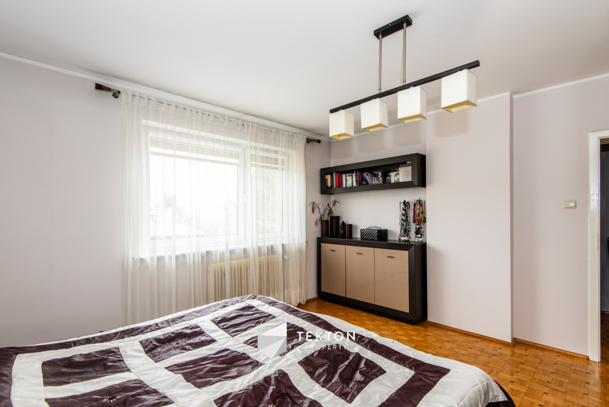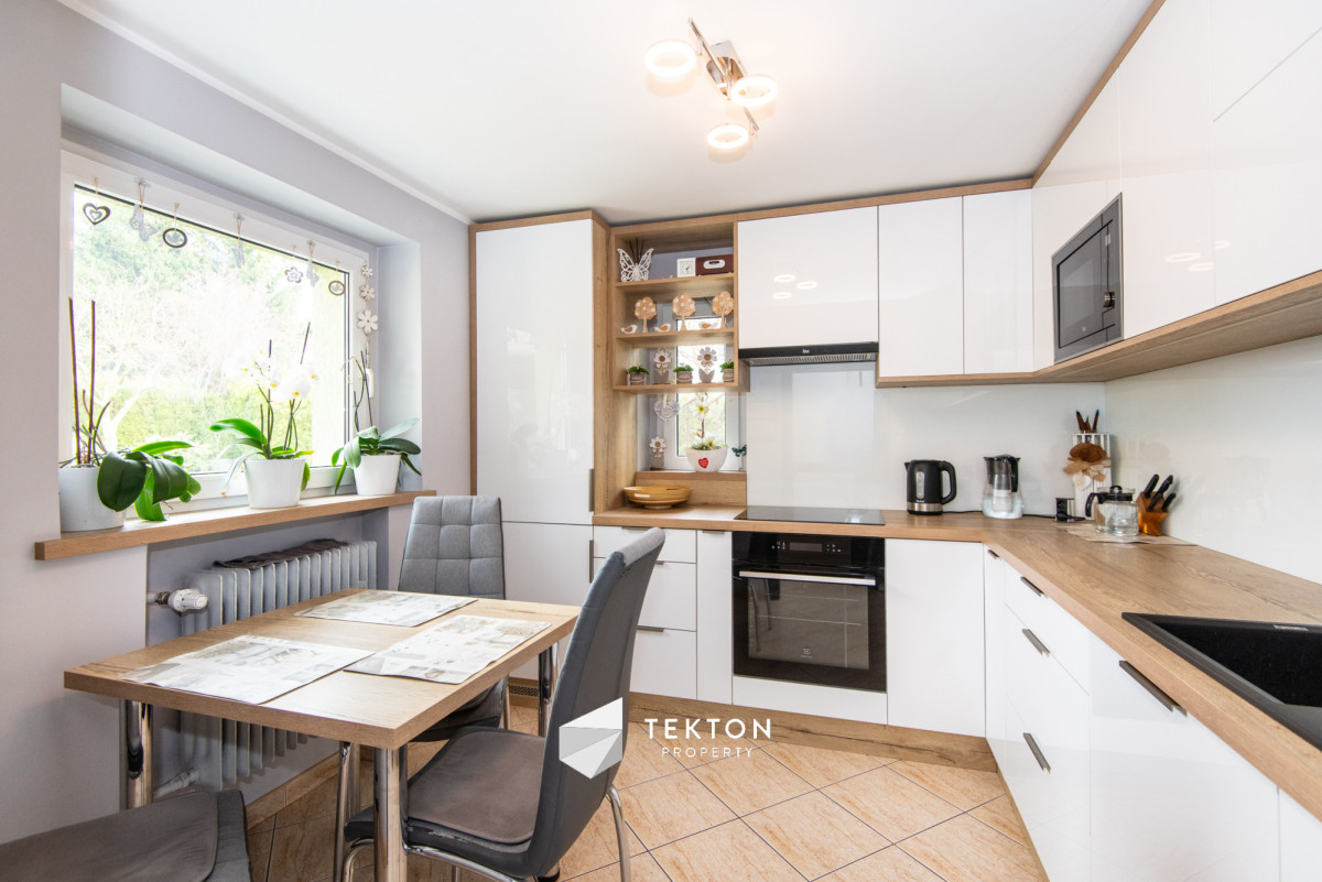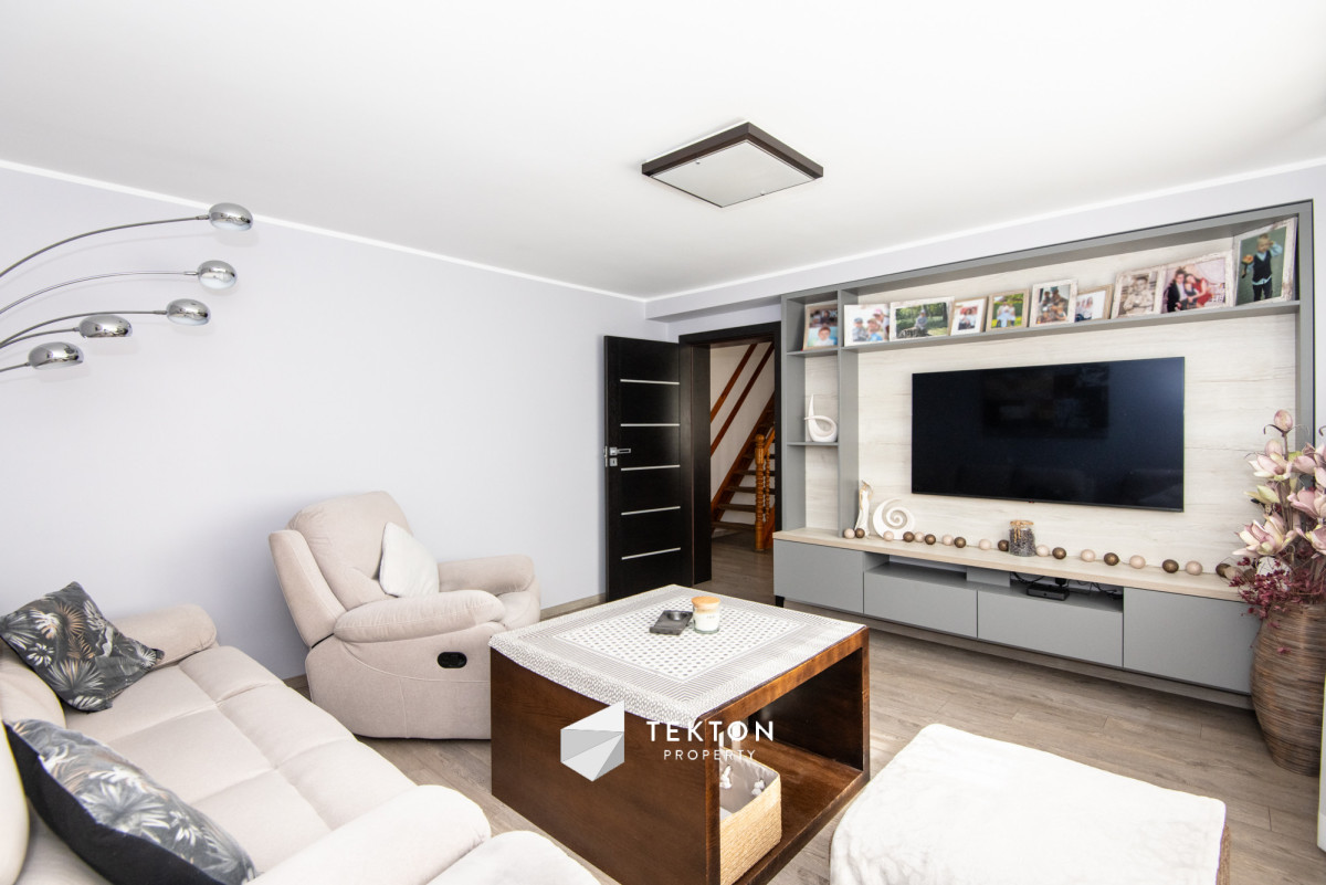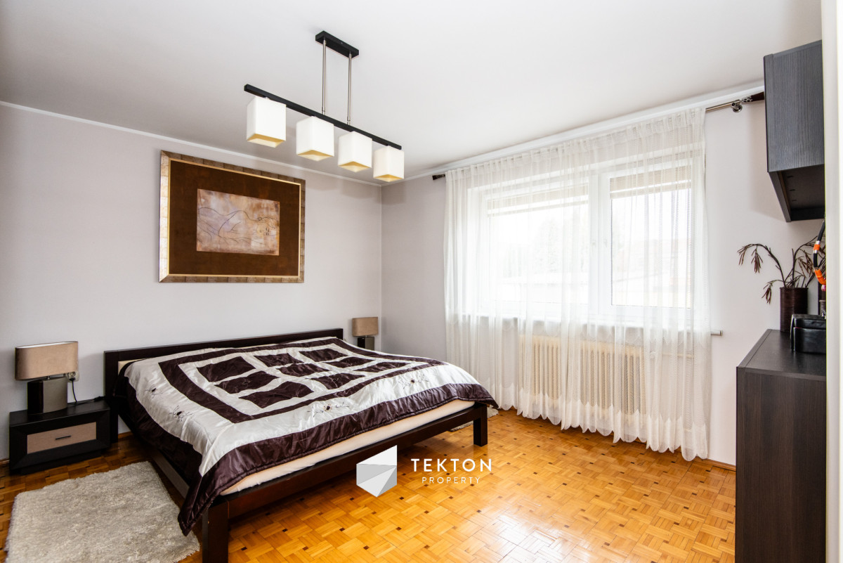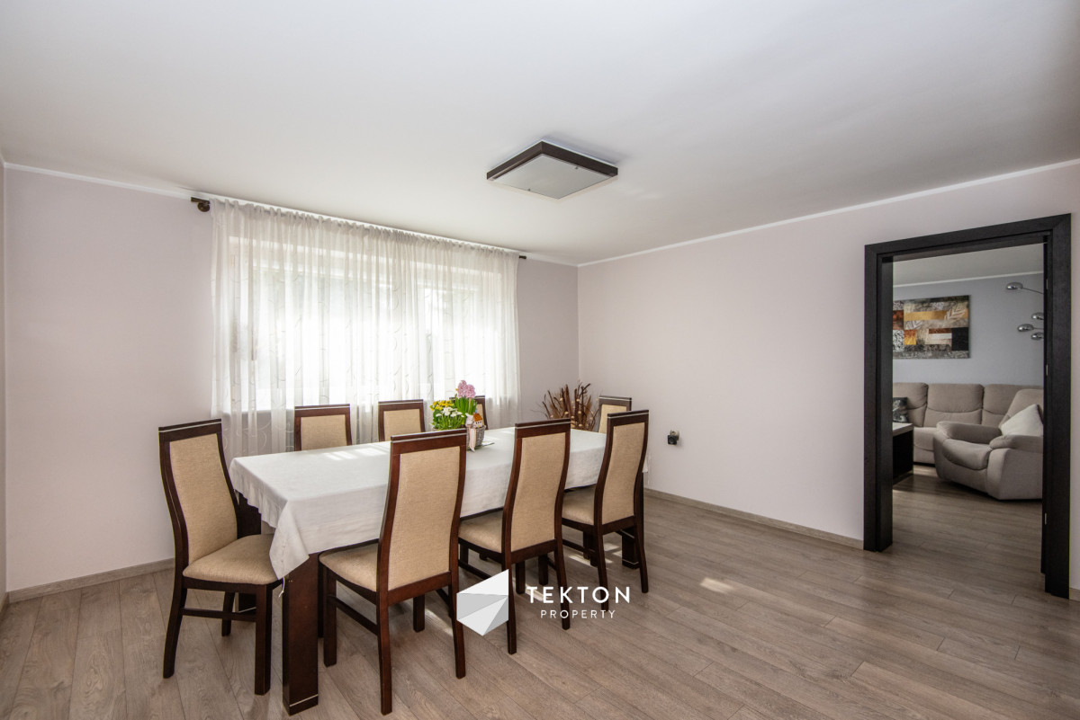 Piętro posiada możliwość niezależnego wejścia zarówno z zewnątrz, jak i poprzez schody wewnętrzne. Dzięki temu dom daje dużą swobodę w organizacji przestrzeni oraz sposobie użytkowania. Działka jest zagospodarowana i ogrodzona, a na jej terenie znajduje się garaż, wiata oraz pomieszczenie gospodarcze. Ogród daje możliwość stworzenia strefy relaksu lub dodatkowej przestrzeni użytkowej. Dach płaski, ocieplony i pokryty nową papą, umożliwia montaż instalacji fotowoltaicznej.