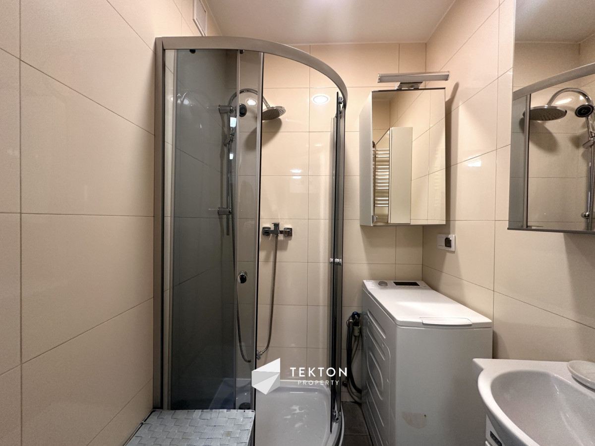 - Łazienka z kabiną prysznicową, umywalką, miejscem na pralkę