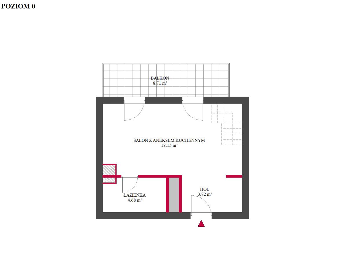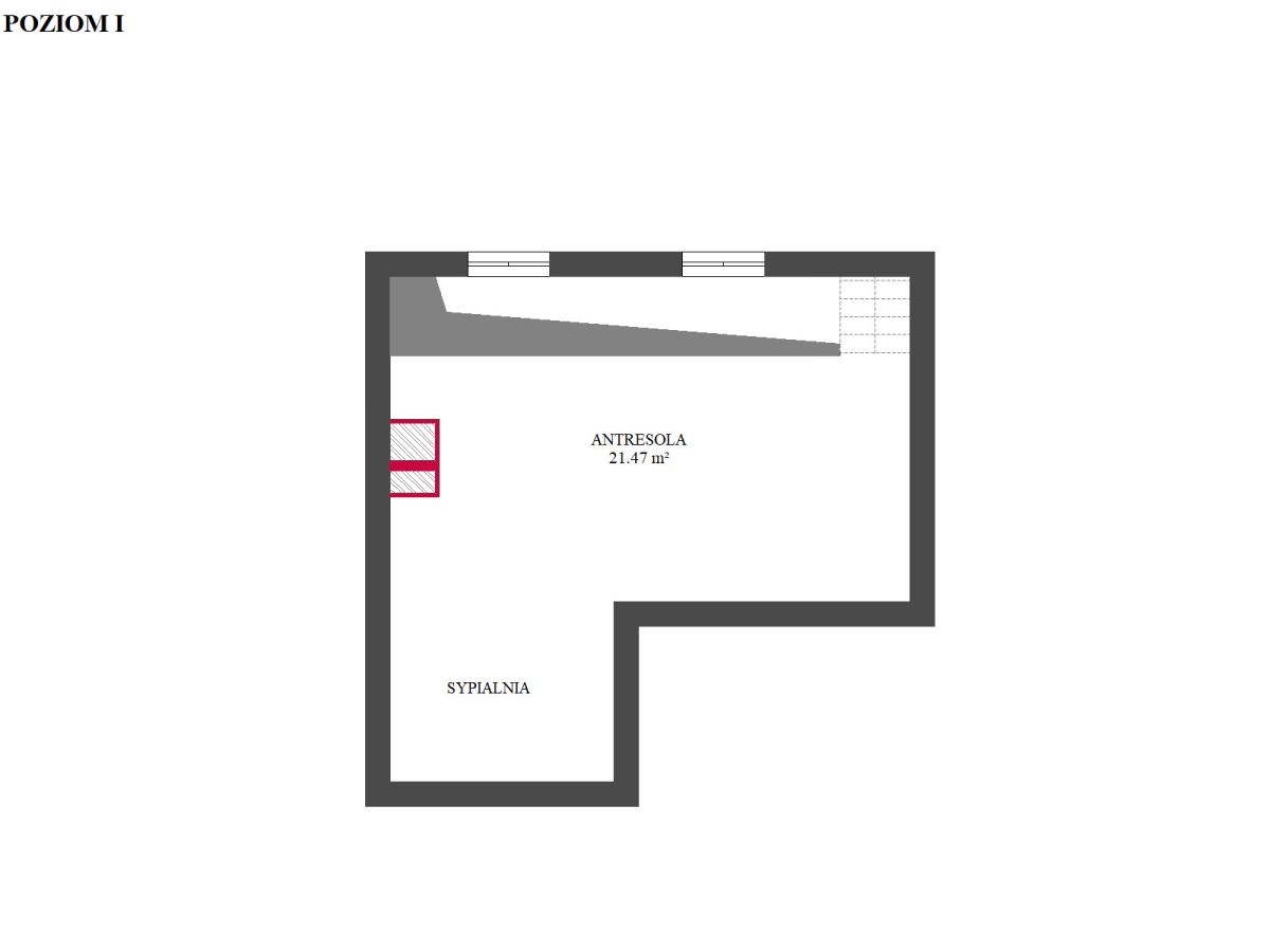 • pomieszczenia: parter- salon z aneksem kuchennym oraz łazienka i przedpokój; poziom drugi – antrsola w której znajduje się sypialnia oraz miejsce do pracy