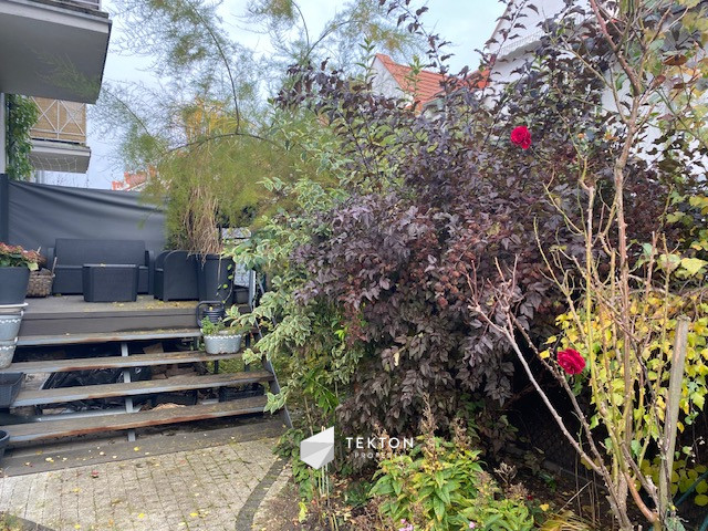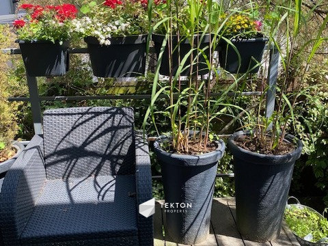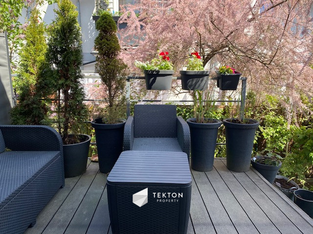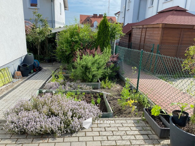 Z salonu prowadzi wyjście na umeblowany taras o powierzchni ok. 9 m², a dalej do prywatnego ogrodu o powierzchni ok. 100 m², zagospodarowanego zielenią i kwiatami. Dodatkowo w ogrodzie znajduje się pomieszczenie gospodarcze, idealne na rowery, meble ogrodowe czy sprzęt rekreacyjny.