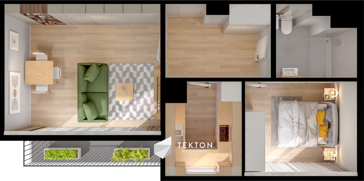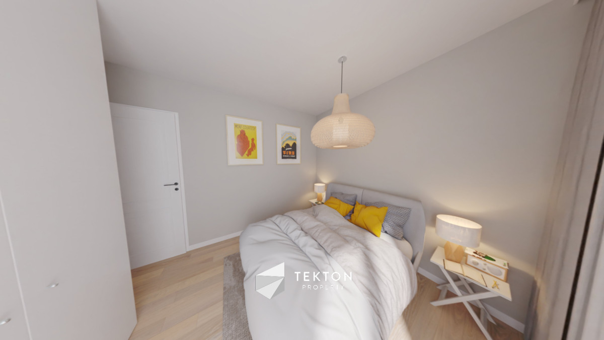 - Oddzielna sypialnia – idealna na łóżko i pojemną szafę; z oknem.