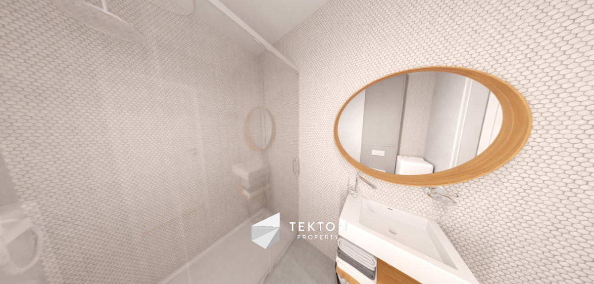 - Łazienka – przestronna z kabiną prysznicową, umywalką i miejscem na pralkę oraz miejscem na wannę.