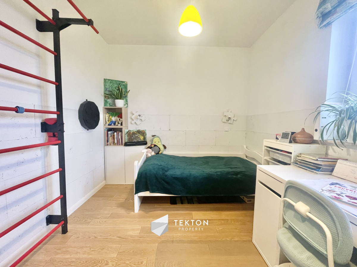Pojemne szafy w zabudowie w korytarzu, sypialniach i łazience, wygłuszona ściana sąsiadująca z innym lokalem, ogrzewanie podłogowe oraz grzejnik elektryczny w łazience, folia termoizolacyjna w salonie, tapeta winylowa oraz płyta tworzywa sztucznego w przedpokoju, zmywalne farby.