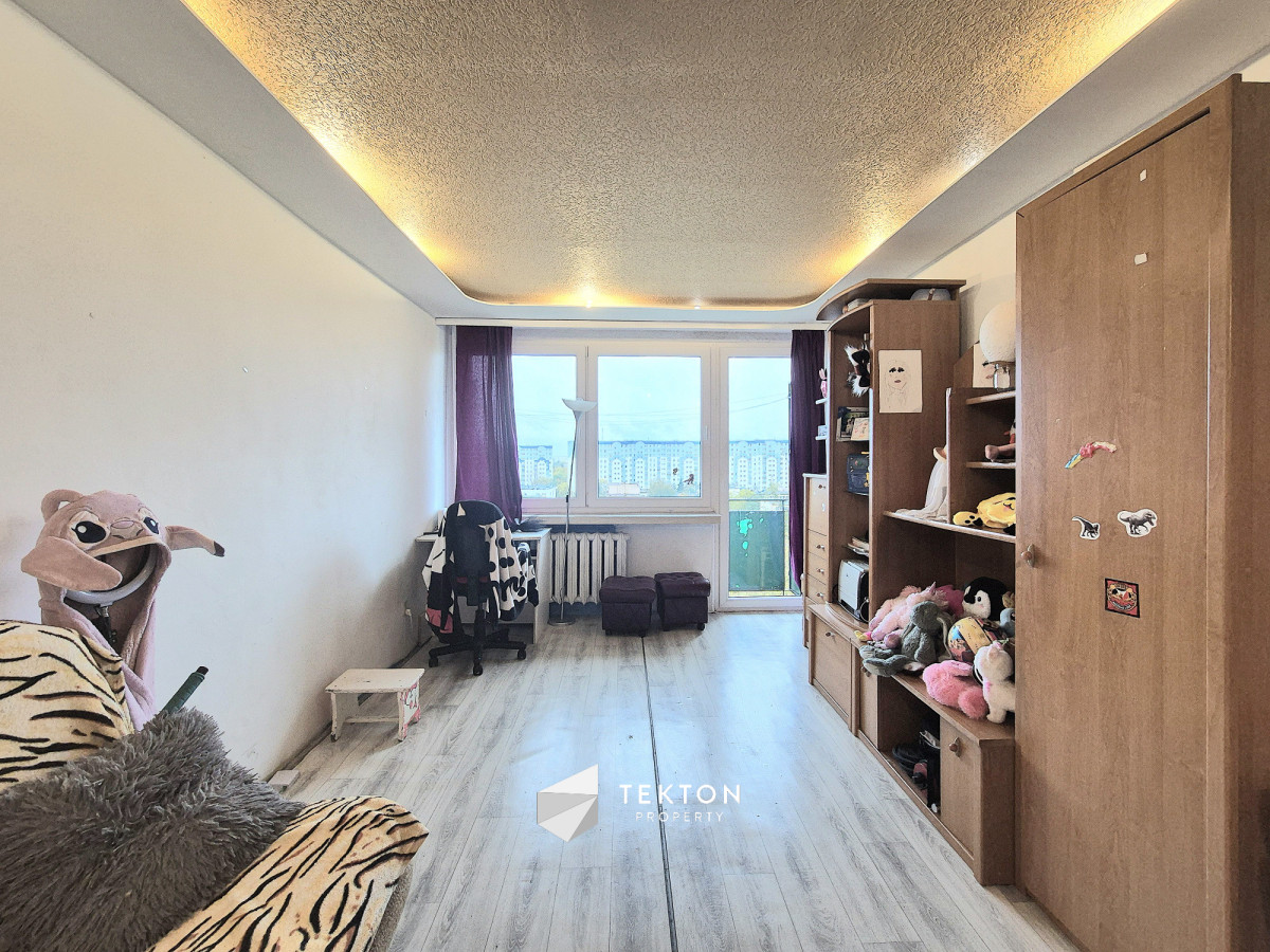Salon ( 17,5 mkw ), z dużym oknem wychodzącym na kształtny balkon z ekspozycją zachodnią przez które wpada odpowiednia ilość słońca