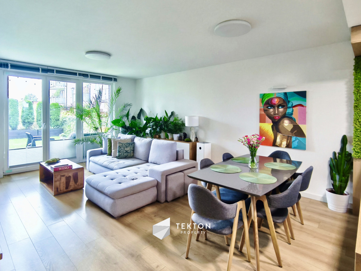 Apartament wyposażony jest w system inteligentnego domu, umożliwiający zdalne sterowanie oświetleniem i temperaturą oraz integrację z czujnikami. W salonie znajduje się również estetycznie wkomponowany biokominek.