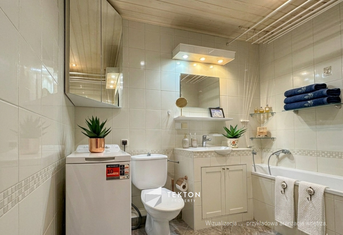 – Łazienki z wanną, wyposażonej w szafki w zabudowie oraz miejsce na pralkę.
