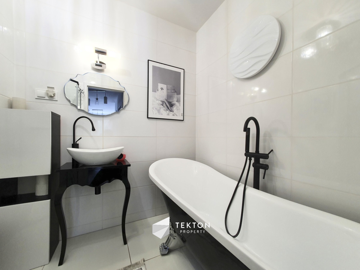 - Łazienka z wanną glamour i osobnym prysznicem.