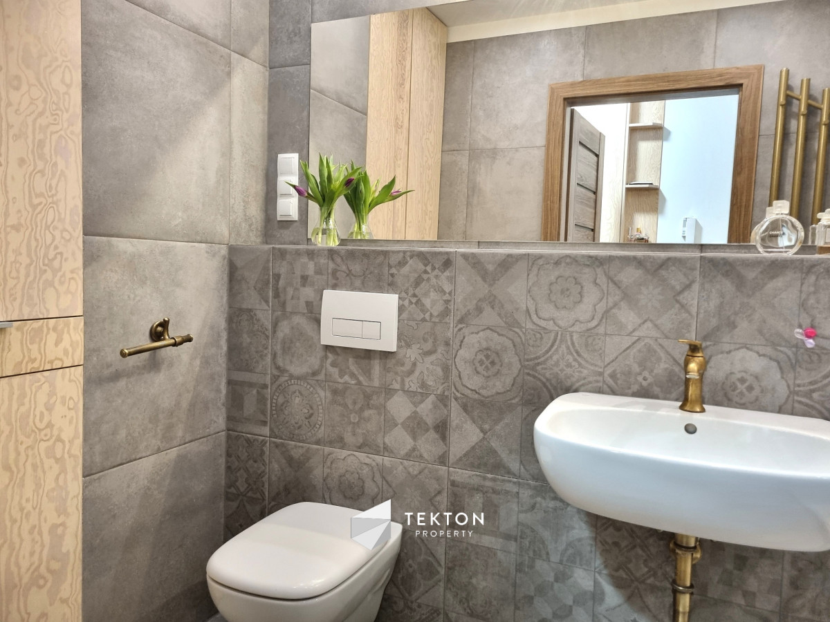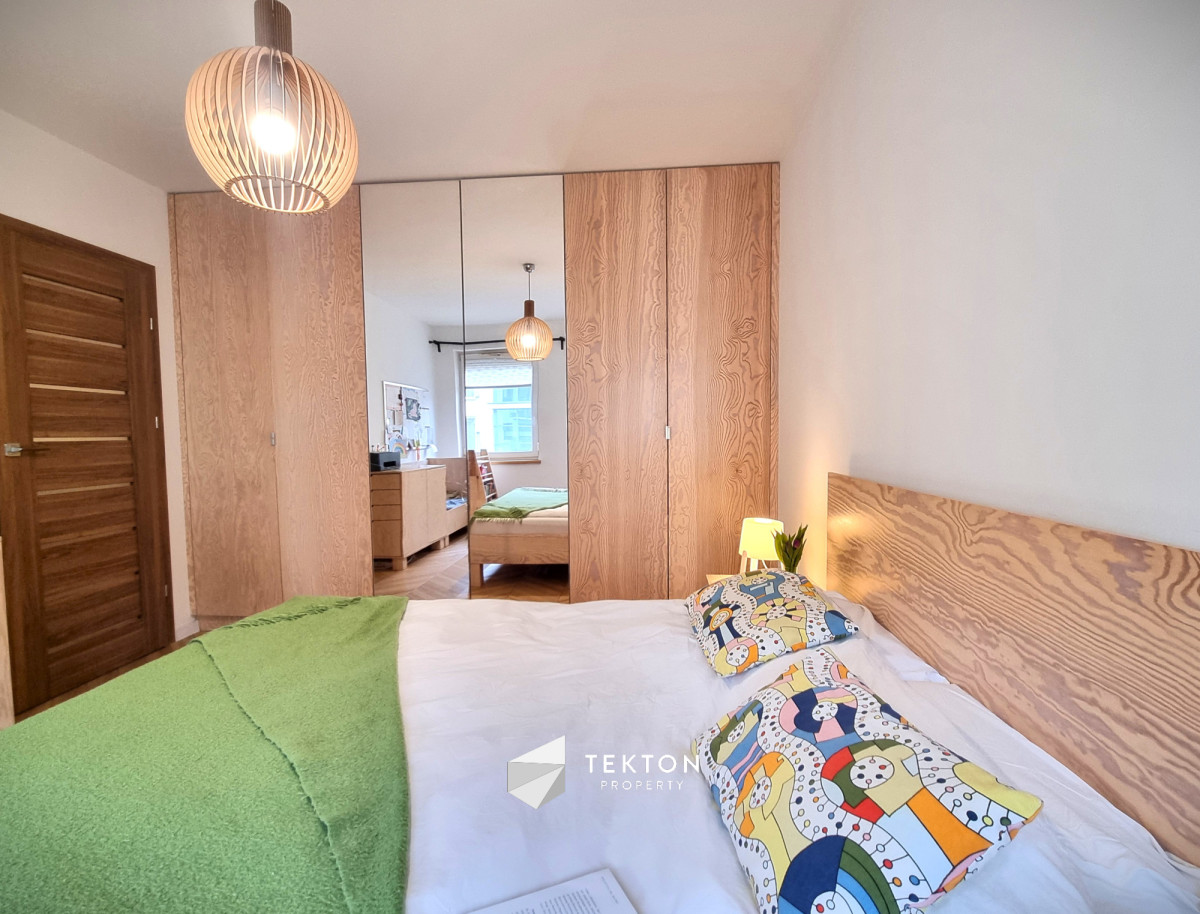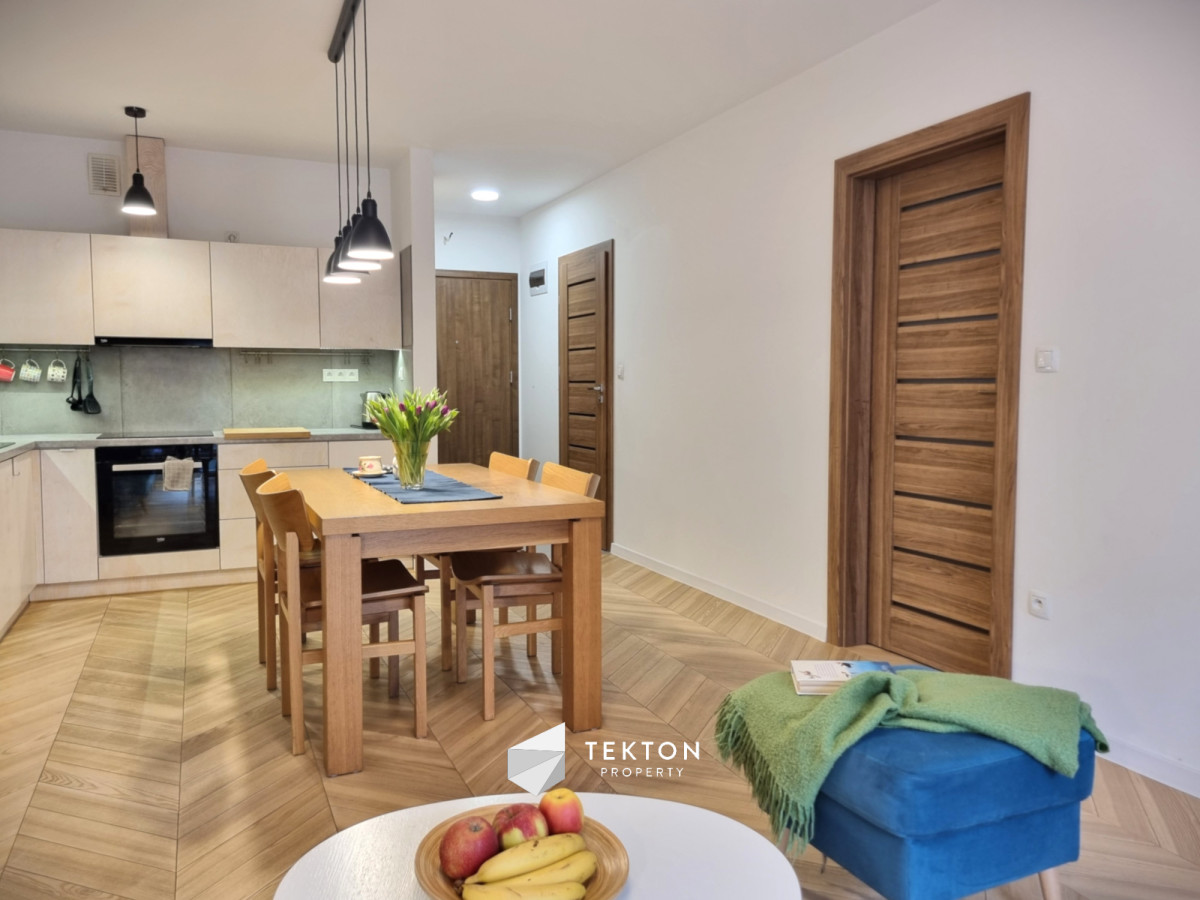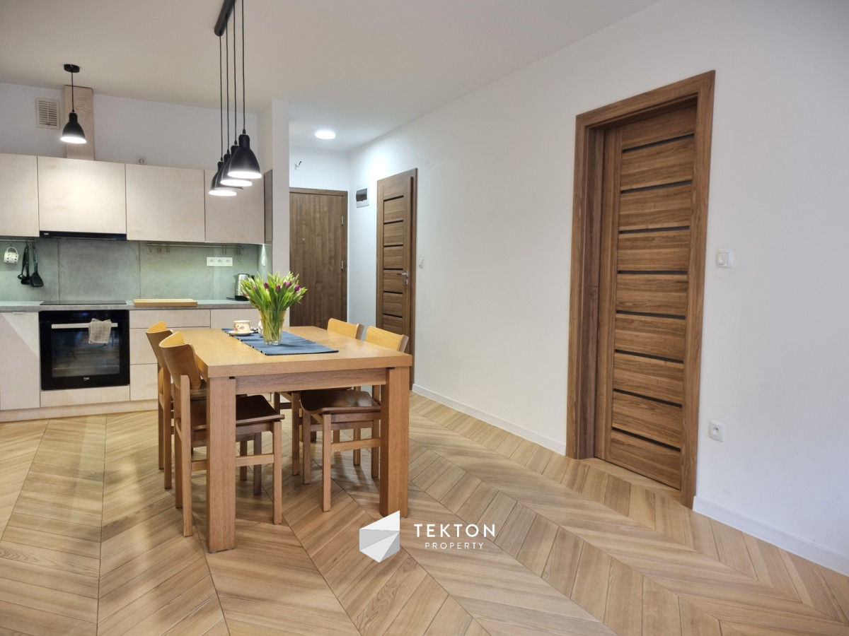 Mieszkanie wykończone z dbałością o detale i funkcjonalność. W pokojach położono deskę jesionową w elegancką jodełkę, w przedpokoju i łazience estetyczne kafle. Kuchnia w zabudowie, otwarta na salon. W sypialni duże łóżko oraz sześciodrzwiowa szafa w zabudowie. Instalacja elektryczna została indywidualnie zaprojektowana na etapie budowy – zwiększona liczba gniazdek oraz praktyczne rozwiązania, m.in. możliwość wyłączenia światła w sypialni bezpośrednio z łóżka. Ekspozycja południowa zapewnia przyjemne światło.