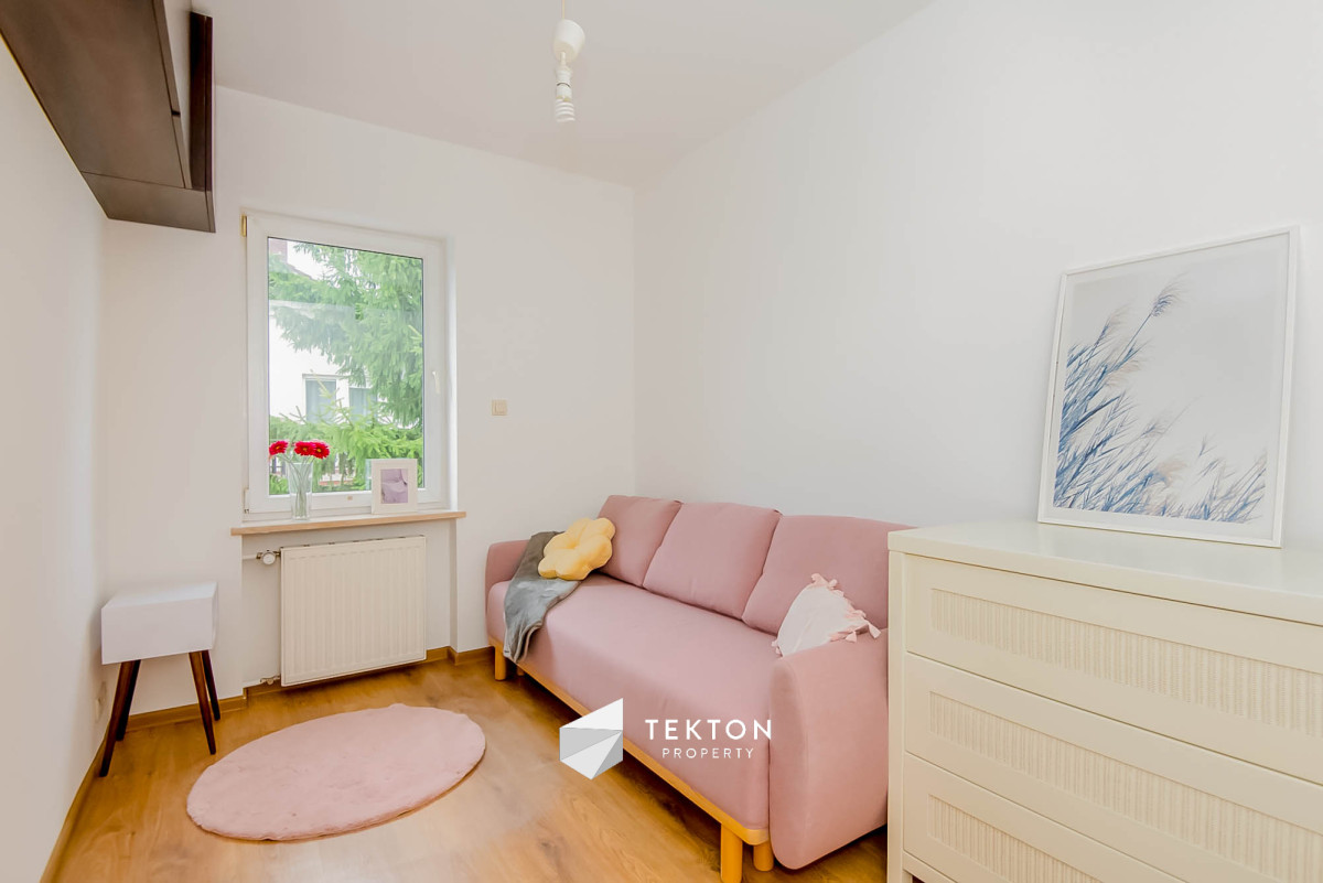 - Ogród – kameralny, w pełni zagospodarowany, z wydzieloną strefą relaksu, miejscem na grilla i placem zabaw dla dzieci