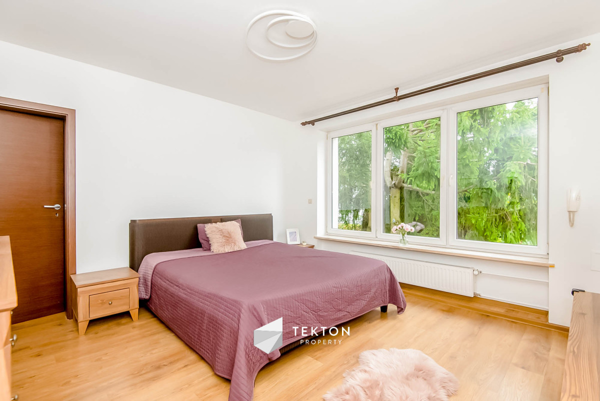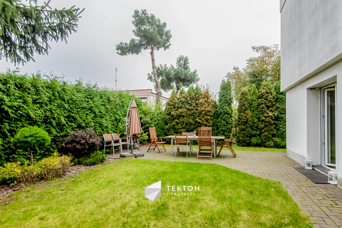 W salonie znajduje się wyjście do ogrodu, który stanowi intymną, prywatną przestrzeń idealną do wypoczynku, spotkań rodzinnych i zabawy dla dzieci, z miejscem na grilla.