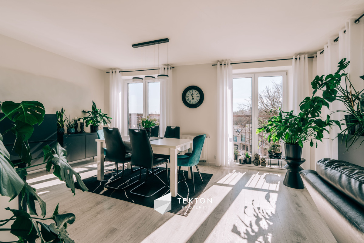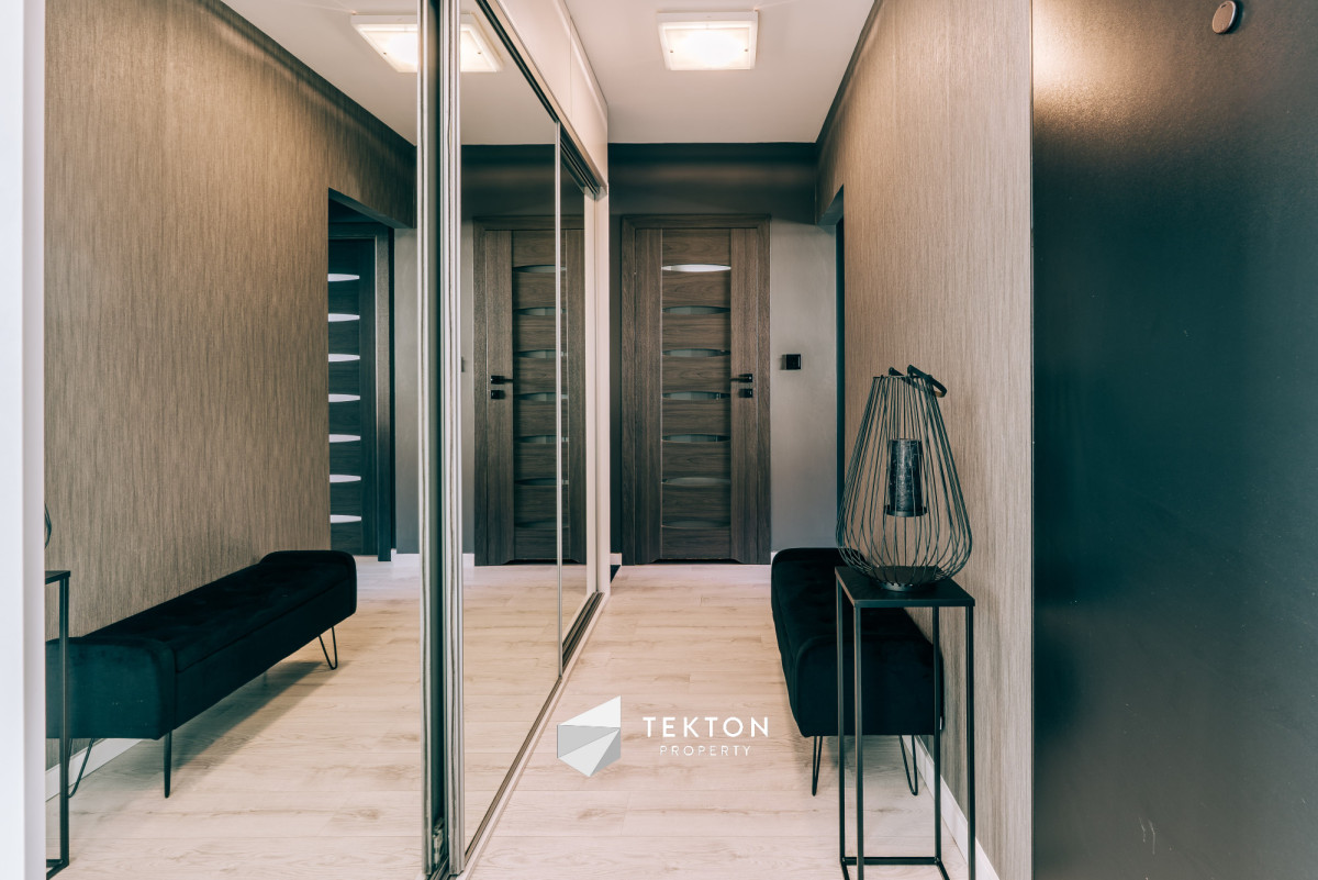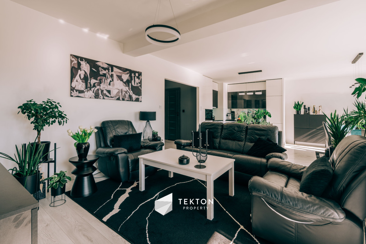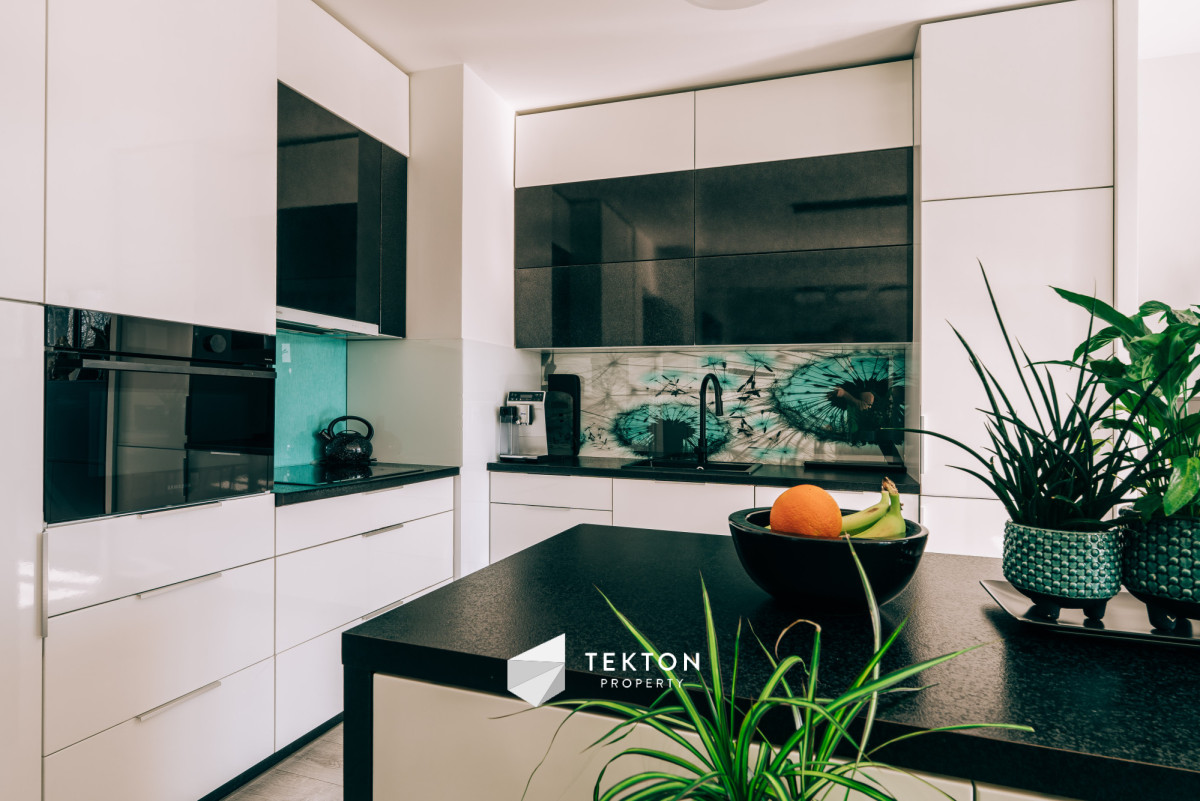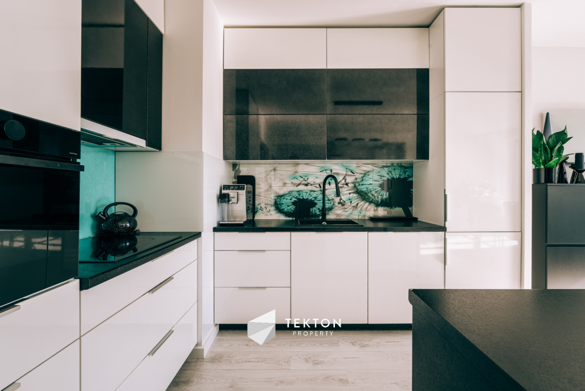 Wnętrze zostało wykończone z wykorzystaniem wysokiej klasy materiałów, w tym paneli premium oraz zabudów stolarskich wykonywanych na zamówienie. Kuchnia wyposażona jest w nowoczesne sprzęty AGD, a okna trzyszybowe zapewniają bardzo dobrą izolację termiczną i akustyczną.